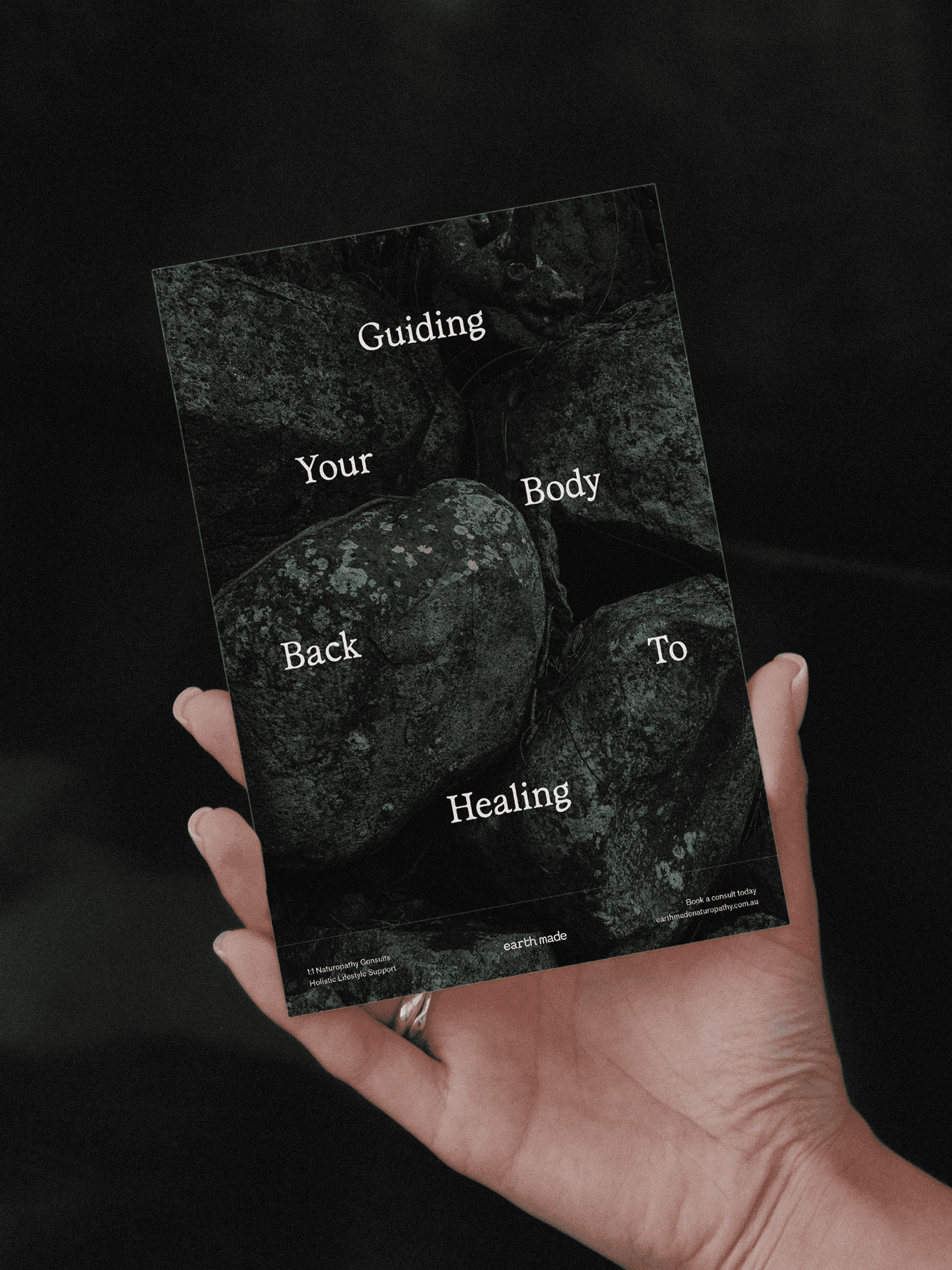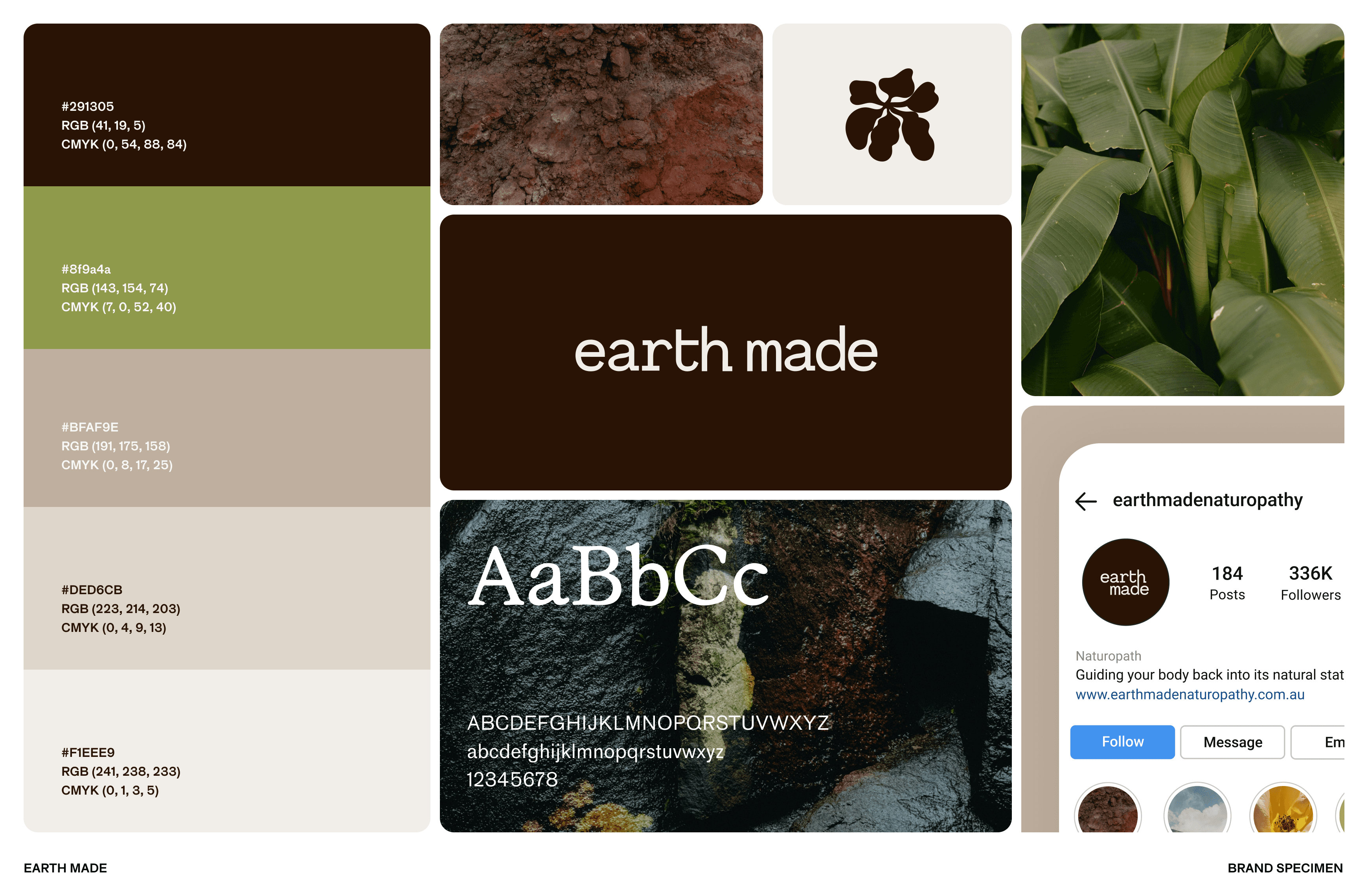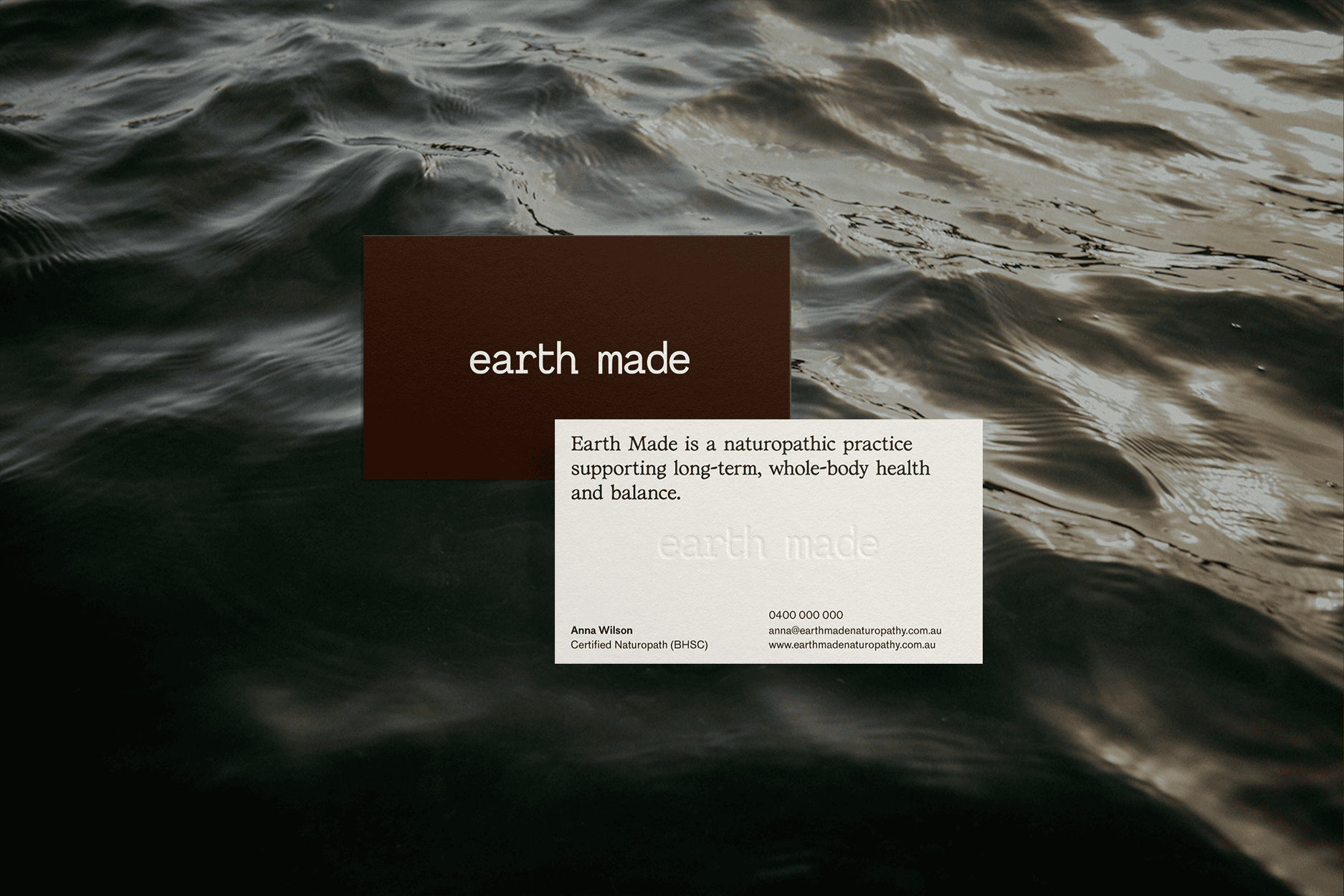 Earth Made is the naturopathic practice of Anna Wilson, specialising in female health and lifestyle support. The brand is grounded in the body’s connection to the earth, using this relationship as a framework to balance clinical credibility with holistic care. The resulting identity is calm and considered, drawing on natural tones, structured systems, and softened details to create a practice that feels both professional and deeply human.